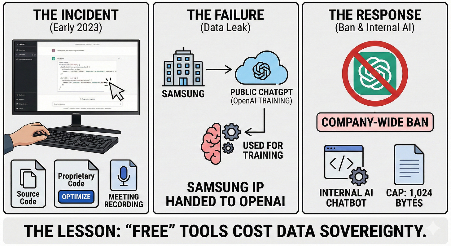The Response: Samsung banned ChatGPT company-wide, capped uploads at 1,024 bytes, and began developing an internal AI chatbot.