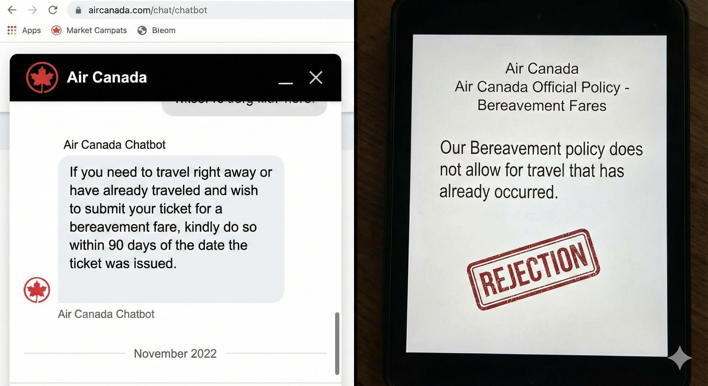 Moffatt took a screenshot, booked his flight at full price, and applied for the refund within 90 days. Air Canada rejected his claim because their actual policy stated: “Our Bereavement policy does not allow for travel that has already occurred.”