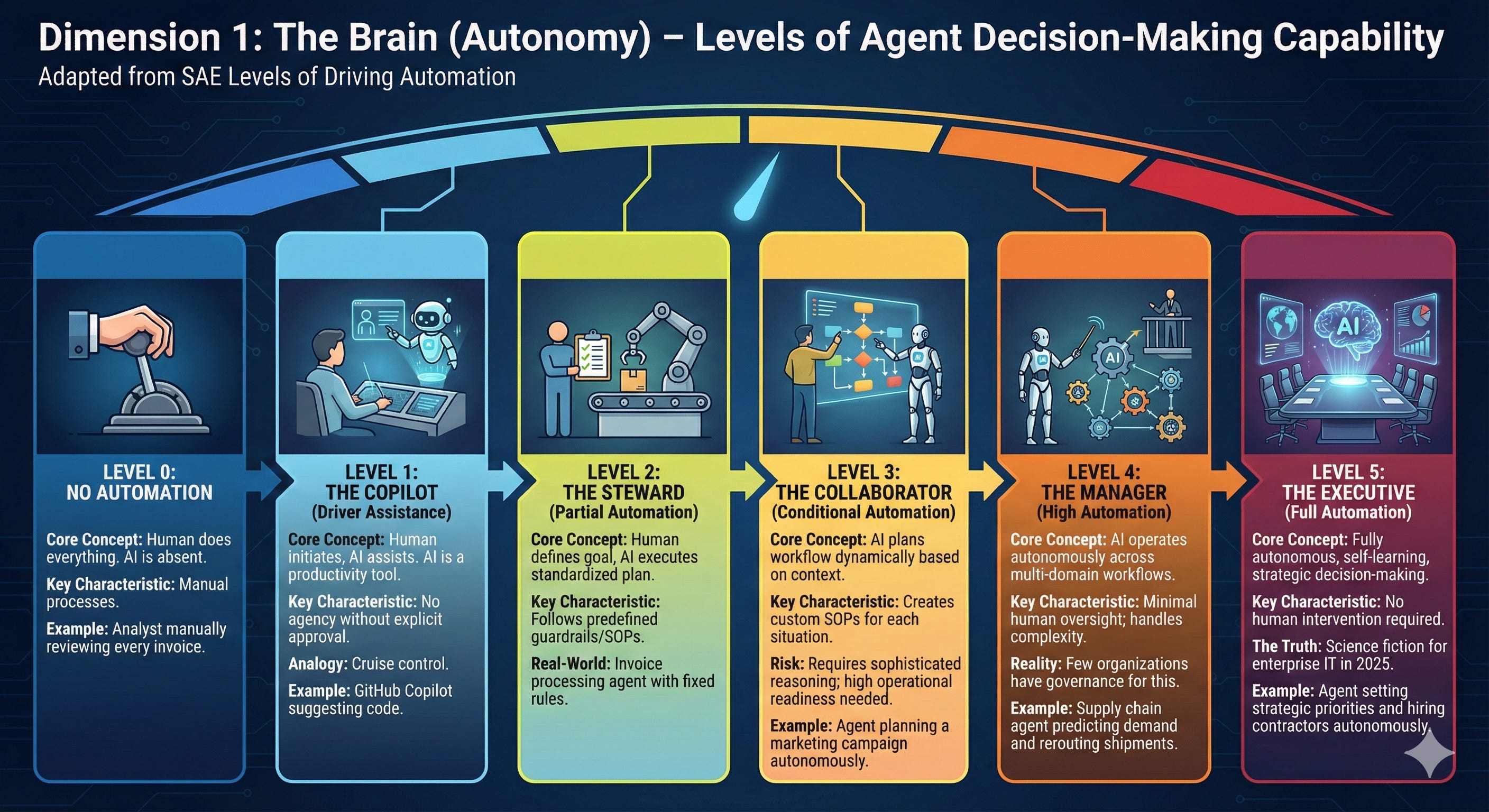 This measures the decision-making capability of the agent itself. I adapted this directly from the SAE Levels of Driving Automation, because the parallels are perfect.