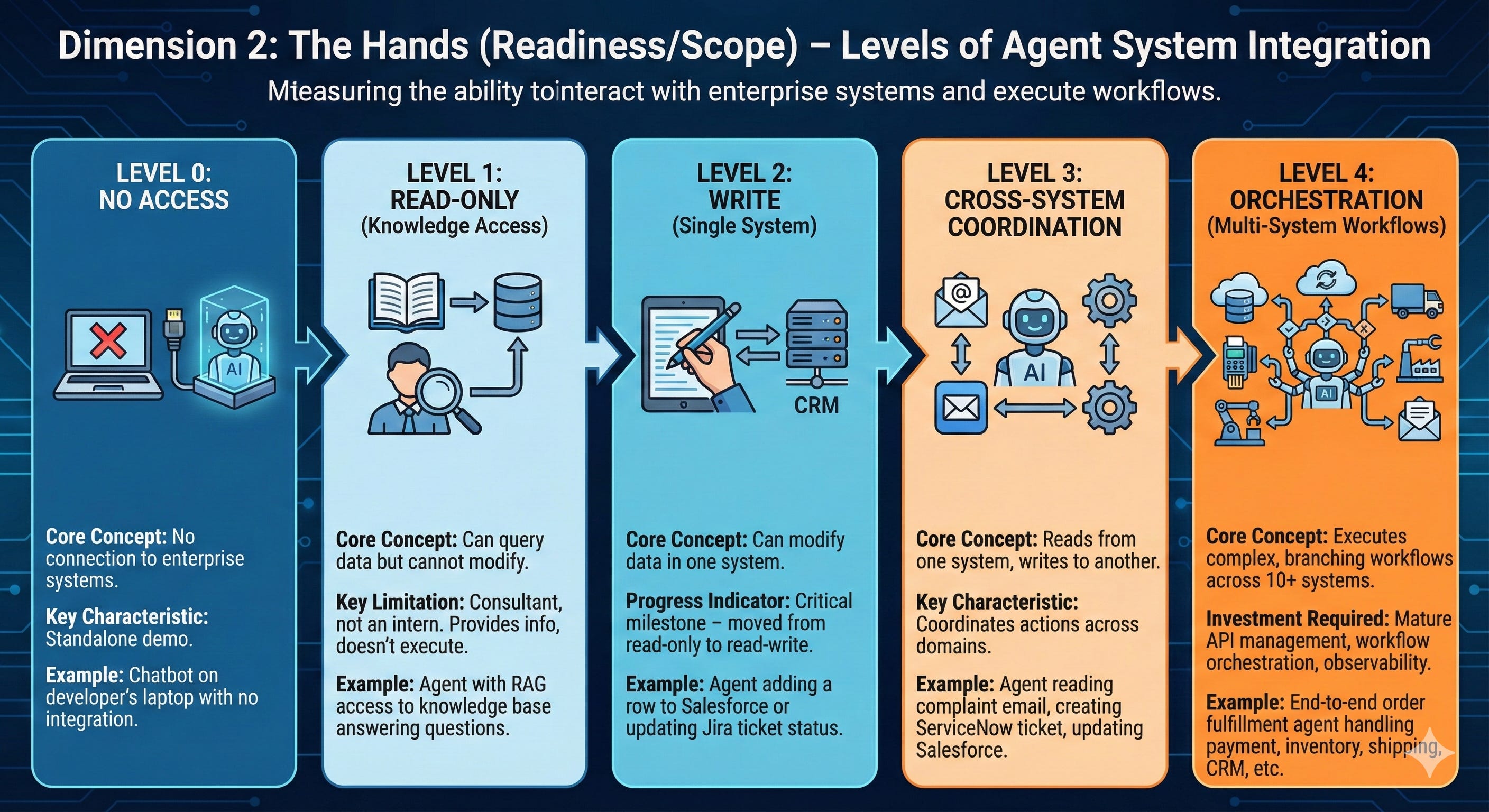 Here’s the pattern I see constantly: Organizations try to jump straight from Level 1 (Copilots that suggest) to Level 4 (Managers that operate autonomously across domains).